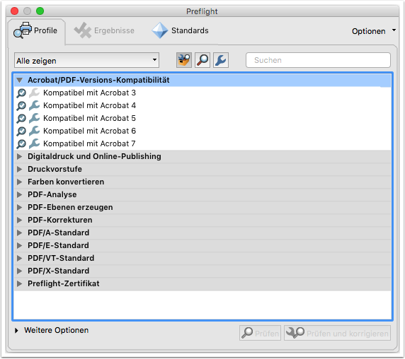 Bei Profilen, die nur Prüfungen enthalten (sowie reinen Prüfungen aus der entsprechenden Gruppe), ist nur "Prüfen" als Knopf aktiv. Sobald ein Profil auch Korrekturen oder Konvertierungen in einen PDF-Standard enthält (und natürlich bei Einzelkorrekturen), kann auch "Prüfen oder korrigieren" ausgewählt werden.