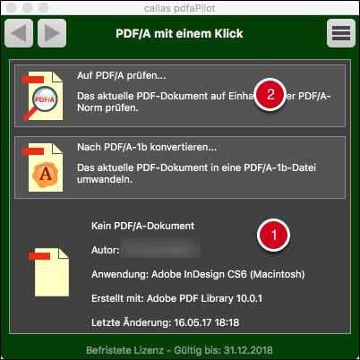 - Im unteren Bereich signalisiert ein grünes Häkchen die erfolgreiche Prüfung auf PDF/A.
