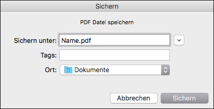 Ein Dialog erscheint, in dem Sie einen Namen und den Speicherort für die neu zu erstellende PDF-Datei eingeben können.