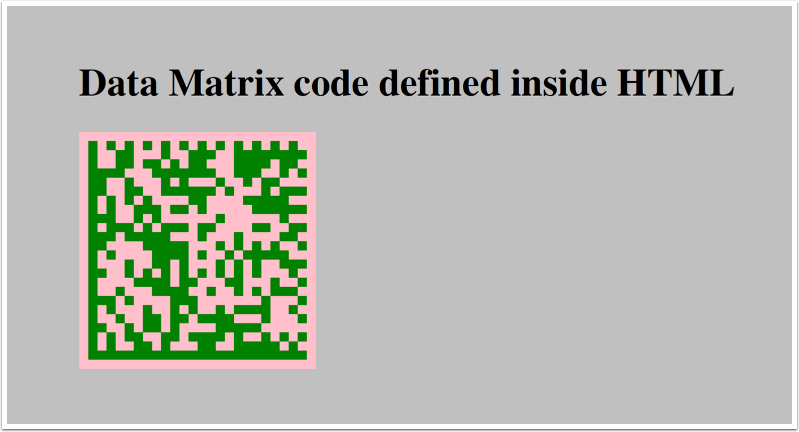 The example code below – which can also be found in the downladable HTML file "Data_Matrix_code_defined_inside_SVG_object.html" – creates a DataMatrix code by means of a barcode object inside SVG which in turn is contained as an SVG object inside HTML. The output is also shown below (the background color "pink" is only used for demonstration purposes. Normally using a white background is preferred).