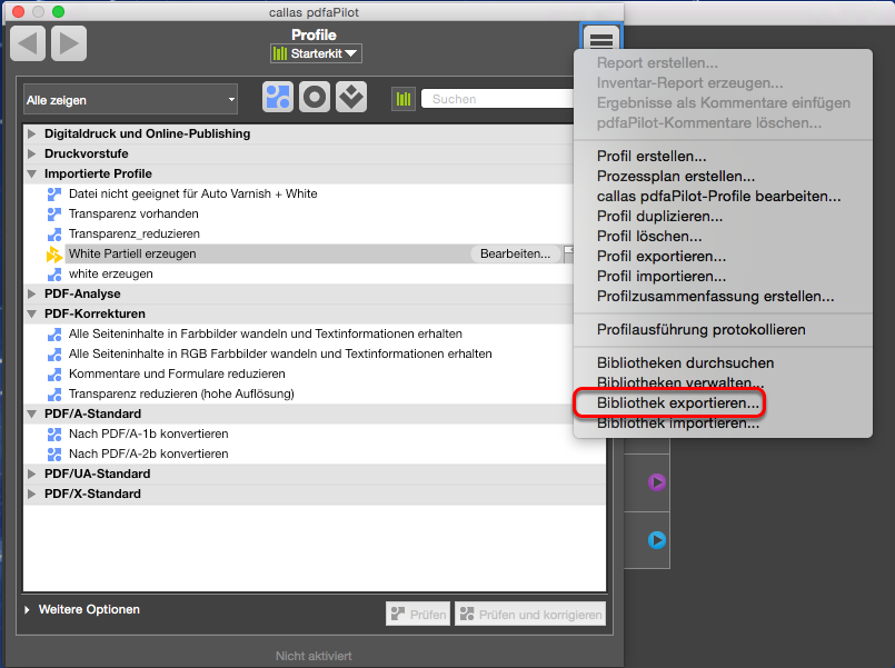 Ihren Profile-Bestand können Sie einfach im Profile-Fenster über den Optionen-Eintrag "Bibliothek exportieren" sichern. Sollten Sie mehrere Bibliotheken verwenden, so muss jede Bibliothek separat gesichert werden.